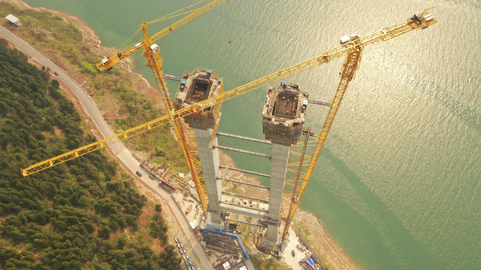新田長江大橋是萬州環(huán)線高速公路項目關(guān)鍵控制性工程,大橋全長約1.7公里,主跨1020米,是三峽庫區(qū)在建跨度最大的雙塔單跨鋼箱梁懸索橋,大橋主塔采用門式框架結(jié)構(gòu),受地形限制,上、下游側(cè)索塔塔柱采用不等高設(shè)計,其左幅索塔總高177.5米,右幅索塔總高161.5米。左幅主塔劃分為30個節(jié)段,采用液壓爬模施工,單節(jié)混凝土澆筑高度達(dá)6米,本主塔在全線率先施工,并按既定節(jié)點目標(biāo)高效完成主塔施工任務(wù)。目前,項目整體施工進度正按預(yù)定計劃快速推進,右幅主塔預(yù)計3月底完成封頂。